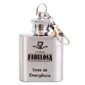 Produzido em MDF nobre com gravação a laser da logomarca Fabulosa, o estojinho abriga uma garrafa miniatura de 50 ml da Cachaça Fabulosa Tradicional (Bálsamo, 6 anos) e um chaveiro inox personalizado em forma de cantil, com capacidade para até 30 ml da cachaça — um verdadeiro mimo para quem aprecia qualidade e estilo.